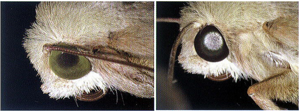 黃色波段燈利用昆蟲(chóng)復(fù)眼的綠-黃光感受器的生物學(xué)功能。夜出型蛾類(lèi)的復(fù)眼在白天為明適應(yīng)狀態(tài)(左上圖),夜間為暗適應(yīng)狀態(tài)(右上圖)。