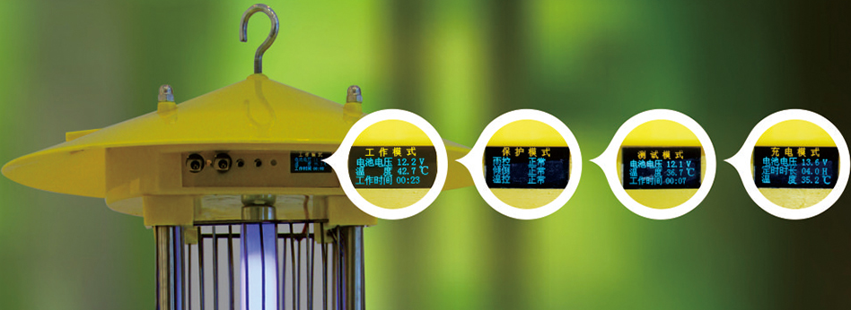 智能液晶顯示殺蟲燈是普通太陽能殺蟲燈的升級(jí)版,采用OLED中文液晶顯示屏幕,可實(shí)時(shí)顯示殺蟲燈的工作模式、充電模式、測(cè)試模式、保護(hù)模式4個(gè)工作狀態(tài),各模式之間可相互切換,方便用戶清晰了解殺蟲燈的工作狀態(tài)。